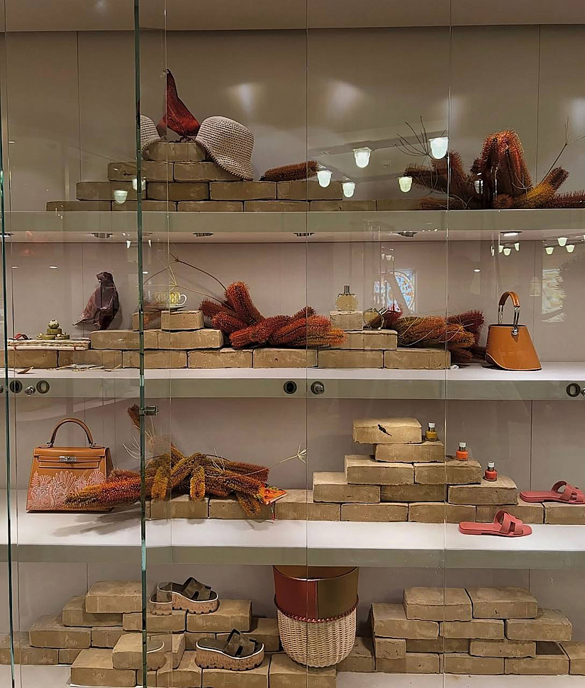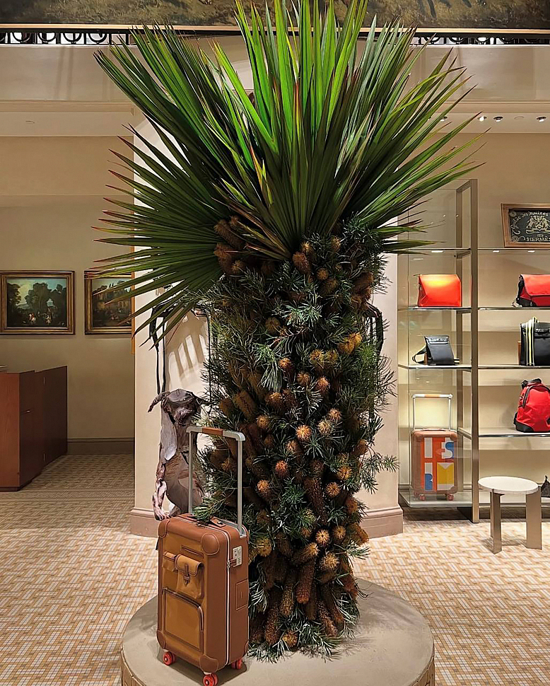 Импровизированная пальма из редких тропических цветов для бутика Hermès в Сан-Жермен в фирменных оранжево-охристых тонах знаменует приход лета.